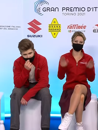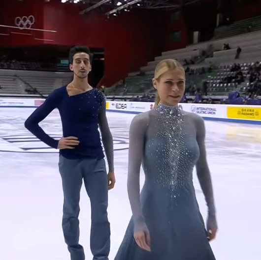 Любимцы туринской публики Каролина Мошени и Франческо Фиоретти открыли прокаты танцоров. Дорожки шагов получились на отлично, а вот твиззлы синхронностью не отличались, увы.