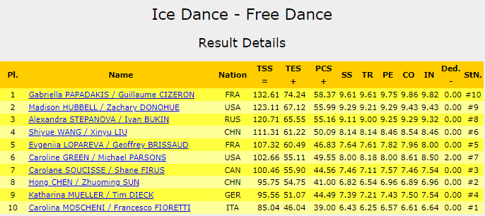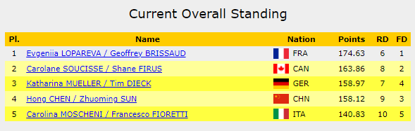 Уроженка Москвы Евгения Лопарёва, выступающая за Францию, и её партнёр Джоффри Брисо, захватывают лидерство после прокатов первых пяти пар.