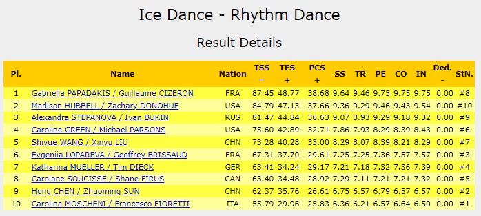 И так, после ритм-танца лидерство захватили французы Габриэла Пападакис и Гийом Сизерон, вторыми идут американцы Мэдиссон Харбелл и Захари Донахью.