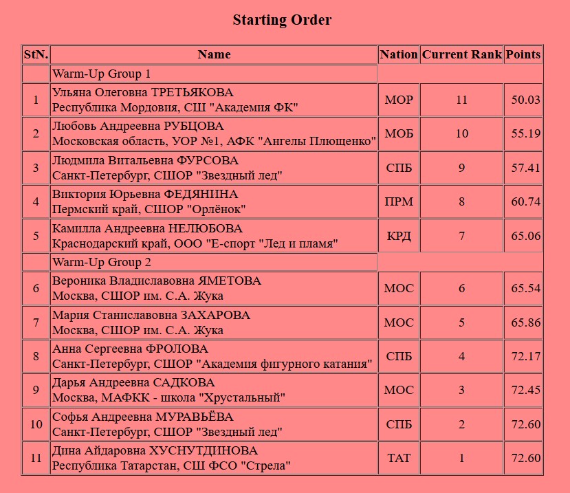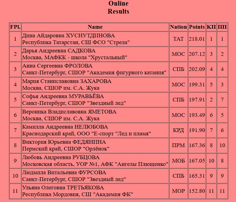 Тройной лутц + двойной аксель + двойной тулуп на старте от Софьи. Далее она исполнила тройной флип + двойной тулуп, тройной риттбергер, тройной сальхов, комбинированное вращение 4 уровня и упала на каскаде тройной лутц + тройной тулуп. После падения сразу ошибка на тройном флипе. И в конце программы исполнила двойной аксель, вращение в либеле 2 уровня, вращение в заклоне 3-го и дорожку шагов 2-го.