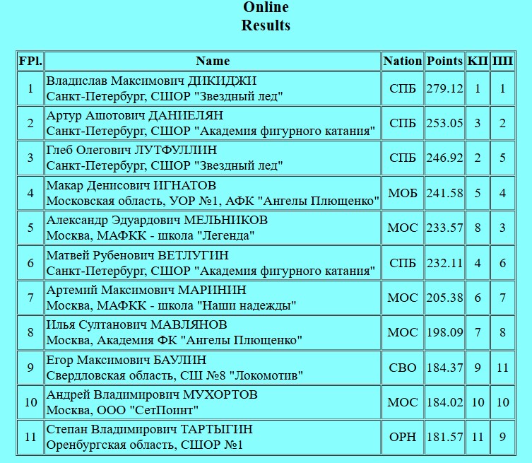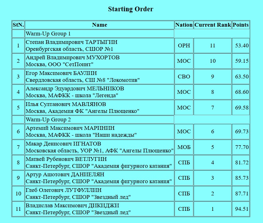 Первым на лёд вышел Степан Тартыгин и получил оценку 128.17. 181.57 - общая.