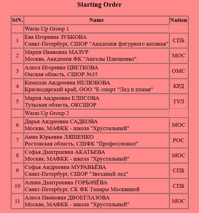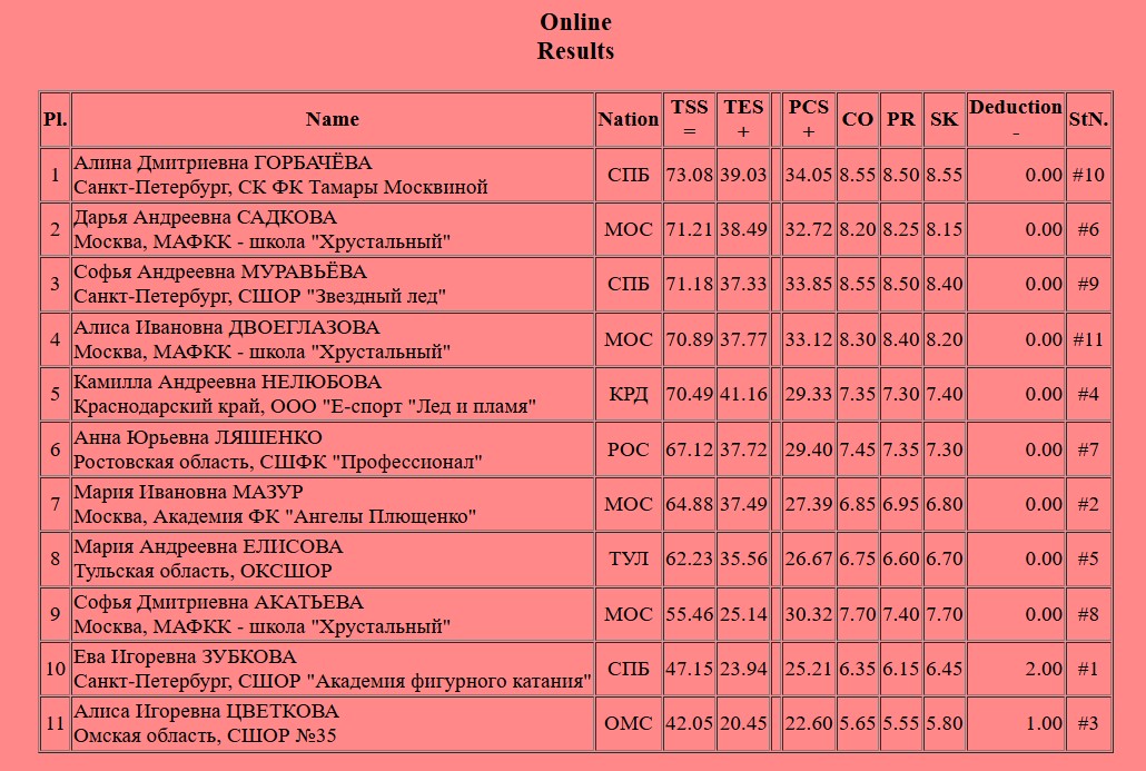 Исполнила на старте тройной флип и двойной аксель, вращение в либеле 4 уровня, каскад 3 лутц + 3 тулуп, вращение в заклоне 4 уровня и дорожку шагов 3-го.