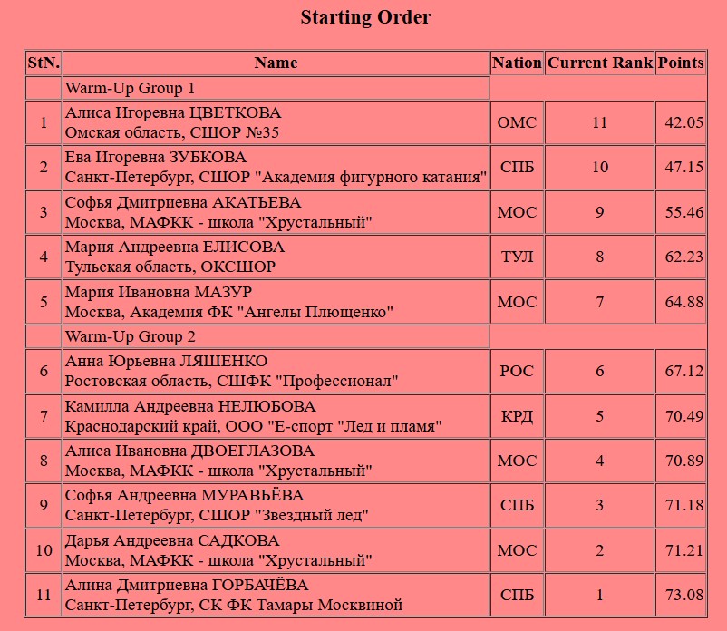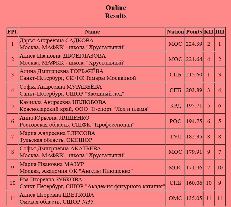 Каскад 3 лутц + 3 тулуп на старте от Софьи. Далее она исполнила 3 флип + 2 тулуп, тройной риттбергер, тройной сальхов, комбинированное вращение 4 уровня и каскад 3 лутц + 2 аксель + 2 тулуп с ошибкой. Далее тройной флип, двойной аксель, вращение в либеле 4 уровня, вращение в заклоне 3-го и дорожка шагов 2-го с ошибкой.