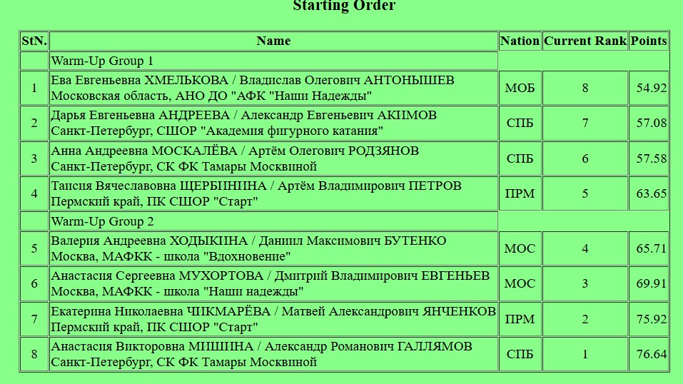 Начали с тройной подкрутки 2 уровня, затем сделали 3 риттбергер + ойлер + 2 сальхов, тройной тулуп, поддержку лассо 3 уровня, выброс на тройной флип, а вот на тройной риттбергер сорван. Далее сделали поддержку с хватом за руку 3 уровня, тодес вперёд внутрь 3-го и парное вращение 4-го.