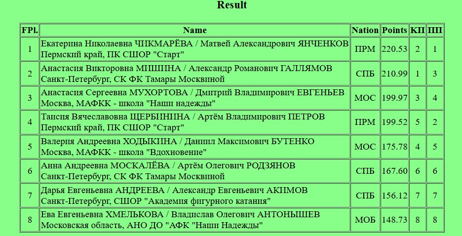 134.35 - оценка Мишиной и Галлямова, 210.99 - общая. Второе место! Чикмарёва и Янченков побеждают!