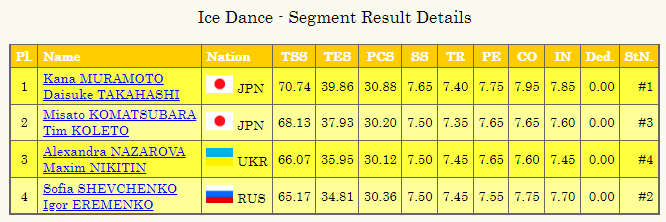 Ещё одна пара из Японии показала свой ритм-танец, на этот раз дуэт Мисато Коматсубара – Тим Колето. Японцы вышли на лёд в дерзких розовых костюмах, чем вызвали шквал аплодисментов на трибунах. Все элементы во время танца в стиле 80-х годов пара исполнила чисто.