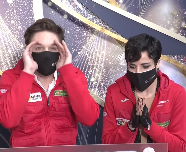 Горячие испанцы Сара Уртадо и Кирилл Халявин подхватили эстафету ритм-танца. Настоящий мастер-класс по поддержкам показали опытные испанцы – всё получилось сегодня на льду у пары.