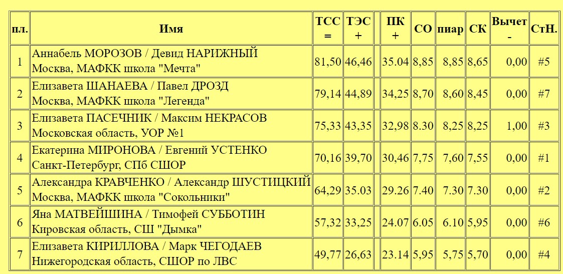 По технике у пары самые высокие баллы, хотя визуально в Москве каталось им легче. Но в любом случае это фавориты соревнований и откатались хорошо.