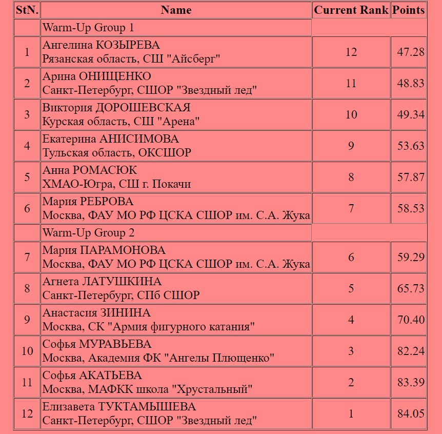 Отличное выступление от Туктамышевой, первое в сезоне и сразу победа. А вот Софья Акатьева после проигрыша Валиевой на первом этапе сегодня не смогла откататься чисто и уступила не только Елизавете, но и Софье Муравьёвой, у которой второе место. Трансляция завершена, провёл её Вячеслав Горбачёв, далее в программе выступление пар.