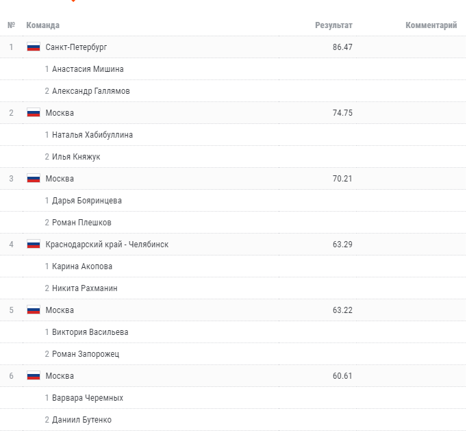 Поздравляем мы Мишину и Галлямова. К слову, их результат превосходит мировой рекорд, но им официально не станет. Завтра продолжим, борьба за серебро должна быть яркой. На этом прощаемся, трансляцию провёл Антон Мозговой.