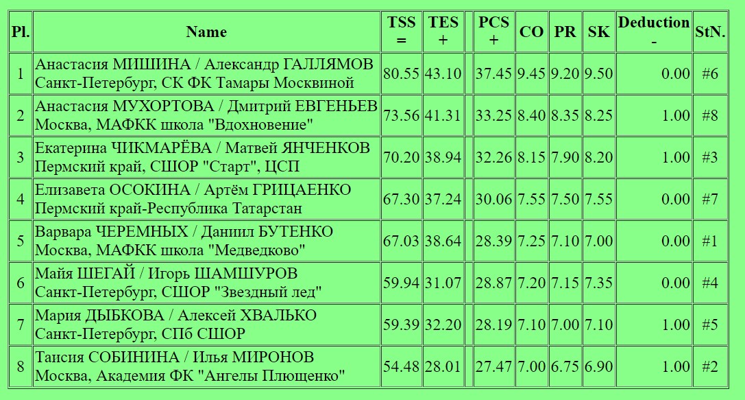 Среднее выступление от пары - 31.07 за технику и 28.87 за компоненты. Это только третье место, предпоследнее на данный момент.