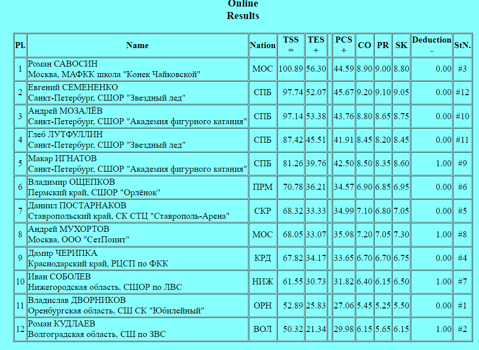 Неожиданная победа фигуриста из первой разминки Романа Савосина, который идеально исполнил два прыжка и каскад. Единственный без каких-то срывов или падений. В итоге у него более 100 баллов за короткую программу, но вся борьба ещё впереди. Трансляция завершена, провёл её Вячеслав Горбачёв, всего хорошего.