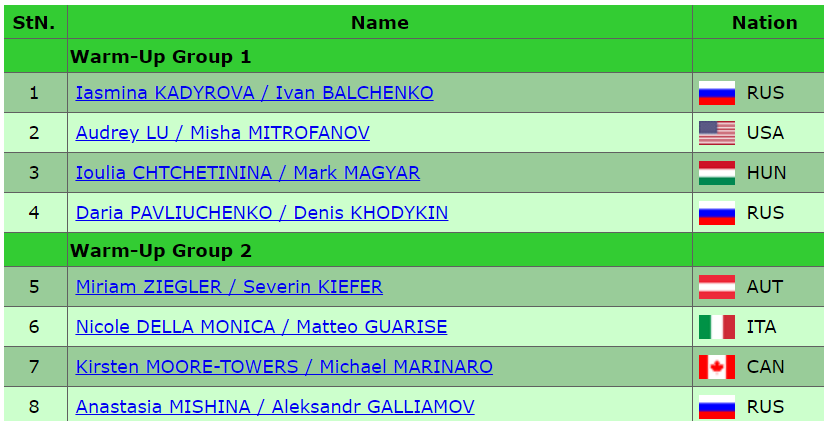 Помимо перечисленных пар на лёд сегодня выйдут американцы Одри Лу и Миша Митрофанов, венгры Юлия Щетинина и Марк Мадьяр, австрийцы Мириам Циглер и Зеверин Кифер, итальянцы Николь Делла Моника и Маттео Гуаризе, а также канадцы Кирстен Мур-Тауэрс и Майкл Маринаро.