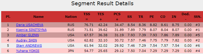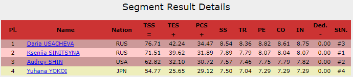 Откатала Ксения свою программу. Тройной луц+тройной тулуп 17-летняя фигуристка исполнила чисто, также чисто зашёл и двойной аксель, да и в целом прокат вполне приличный. Заслуженно получает 71.51 балла ученица Пановой.