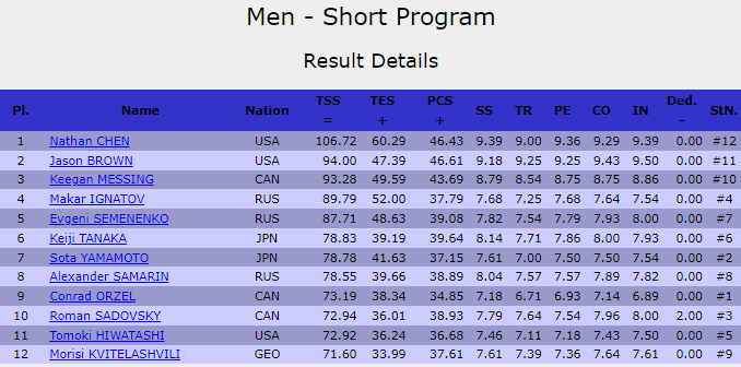Джейсон Браун из США ярко и здорово откатал короткую программу! За свой прокат ученик Брайана Орсера и Трейси Уилсон зарабатывает 94.00 балла, а это серьёзная заявка на итоговое лидерство. Технический набор американца выглядит следующим образом: тройной флип, тройной аксель, каскад 3 лутц + 3 тулуп, плюс вращения и дорожка четвёртого уровня сложности. Безусловно, лучшее выступление сегодня.