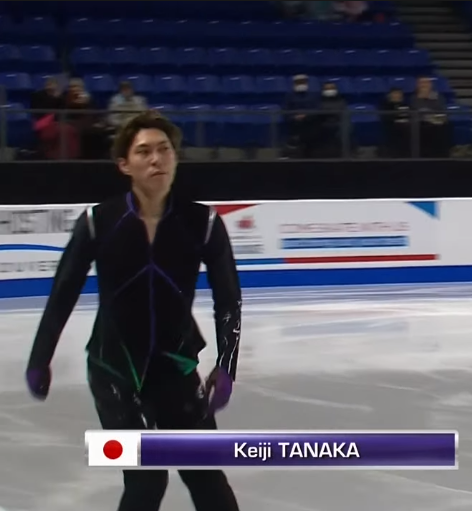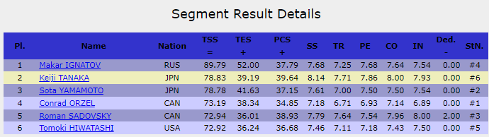 Кейдзи Танака из Японии закрыл первую разминку, заработав 78.83 балла. Второе место на данный момент у японца. Перед выходом на лёд второй группы участников судейский протокол выглядит следующим образом: