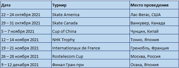 Серия Гран-при среди взрослых фигуристов стартует турниром в американском Лас-Вегасе, который примет свой этап 22 октября. Далее серия отправится в соседнюю Канаду, где 29 октября пройдёт этап в Ванкувере. Уже пятого ноября лучшие фигуристы планеты порадуют своим мастерством китайский Чунцин, после чего серия продолжится в японском Токио.