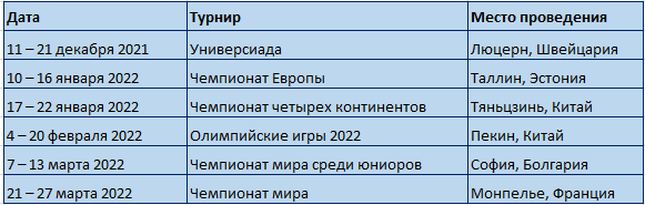 Чемпионат России в Санкт-Петербурге, по итогам которого определится состав олимпийской сборной, стартует 21 декабря и продлится до 25 числа. После баталий на берегах Невы фигуристов ждёт вояж в Таллин, где с 10 по 16 января пройдёт чемпионат Европы. Далее мир российского фигурного катания отправиться в предолимпийскую гримёрку, где будет две недели готовиться к главному старту четырёхлетия: Олимпиада в Пекине стартует 4 февраля. Разумеется, сборная России отправится в Поднебесную заблаговременно.
