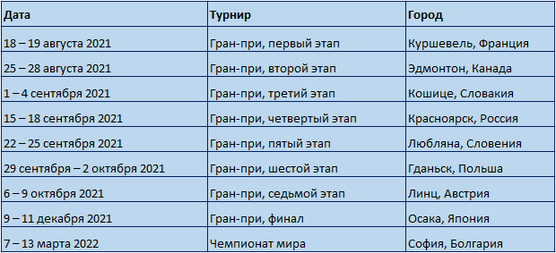 Закончится отборочный этап Гран-при этапами в Гренобле (19-22 ноября) и Москве: турнир в белокаменной стартует 26 ноября. Финальный этап традиционно примет японская Осака, первый день соревнований намечен на девятое декабря.