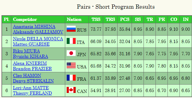 Спортсмены из России появились на льду последними и заработали за своё выступление 73,77 балла. Судьи оценили технику в 37,93 балла, а компоненты — в 35,84 балла.
