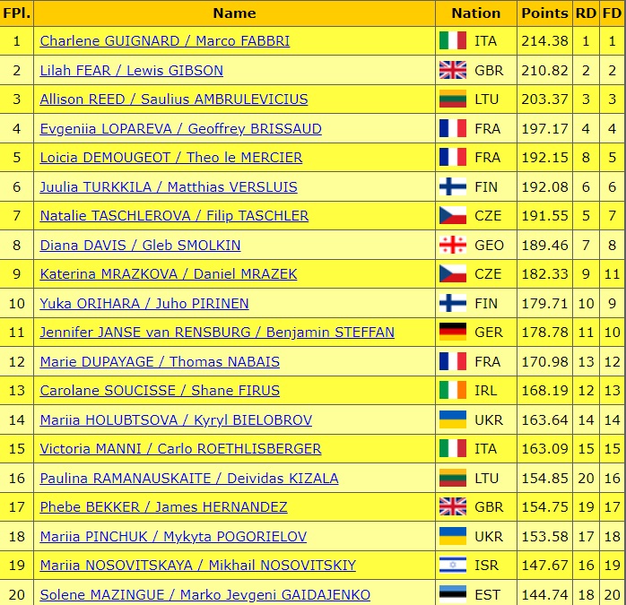 Победу одержали итальянские фигуристы Шарлен Гиньяр и Марко Фаббри. Они набрали 214,38 балла. Вторыми стали британцы Лайла Фир и Льюис Гибсон. На их счету 210,82 балла. Замкнули тройку литовцы Эллисон Риди Саулюс Амбрулевичус.Их танец был оценён в 203,37 балла.
