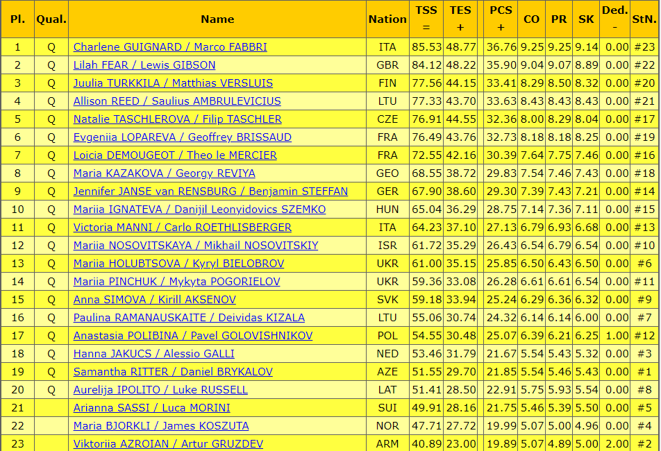 Лидирует итальянская пара Шарлен Гиньяр и Марко Фаббри. Они набрали 85,53 балла. Вторыми идут представители Великобритании Лайла Фир и Льюис Гибсон. На их счету 84,12 балла. Третье место занимают финны Юлия Турккила и Маттиас Верслуйс. Их танец был оценён в 77,56 балла.
