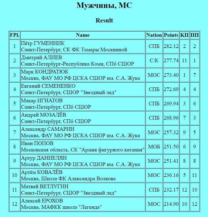 Sport.ru/Фигурное катание. В Санкт-Петербурге соревнованиями у мужчин завершился финал Гран-при России. Победу одержал Пётр Гуменник, который набрал 282.12 балла. В короткой и произвольной программе он был вторым.