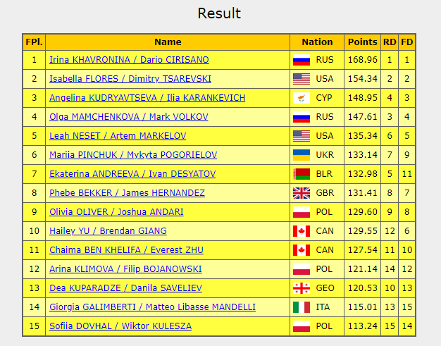 Победу одержали россияне Ирина Хавронина и Дарио Чиризано. За два танца они набрали 168,96 балла. На втором месте расположились американцы Изабелла Флорес и Дмитрий Царевский. Они набрали 154,34 баллы. Замкнули тройку представители Кипра Ангелина Кудрявцева и Илья Каранкевич. На их счету 148,95 балла.