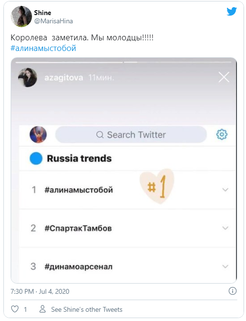 Хештег #алинамыстобой за считанные дни приобрёл такую популярность в твиттере, что оказался на вершине топ записей.