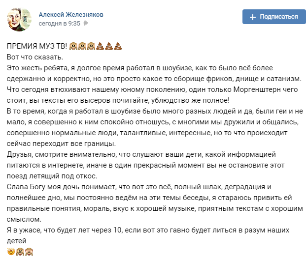 Также от Железнякова досталось и известному исполнителю Моргенштерну, который, откровенно говоря, вёл себя на вручении музыкальной премии весьма провокационно: на саму церемонию исполнитель "прикатил" на инвалидной коляске, а когда победителем в номинации "Лучший исполнитель" объявили Александра Ревву, то Моргенштерн в грубой форме выразил свой протест с решением жюри.