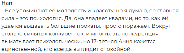 - Среди всех чемпионок из России Анна – самый большой "джентльмен" в интервью. Она заслужила титул чемпионки мира. Однако уже через несколько лет её тело начнёт округляться, после чего она может остаться без прыжков и исчезнуть. Надеюсь, что это время наступит чуточку попозже, - написал подписчик Yahoo под ником Kma.