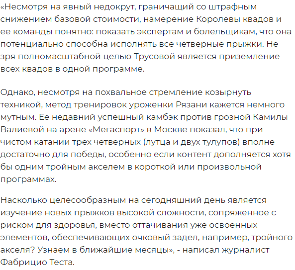 Журналист считает, что на сегодняшний день Александра ещё не готова исполнить данный элемент чисто, более того, Теста не уверен, что для Трусовой целесообразно осваивать риттбергер уже сегодня.