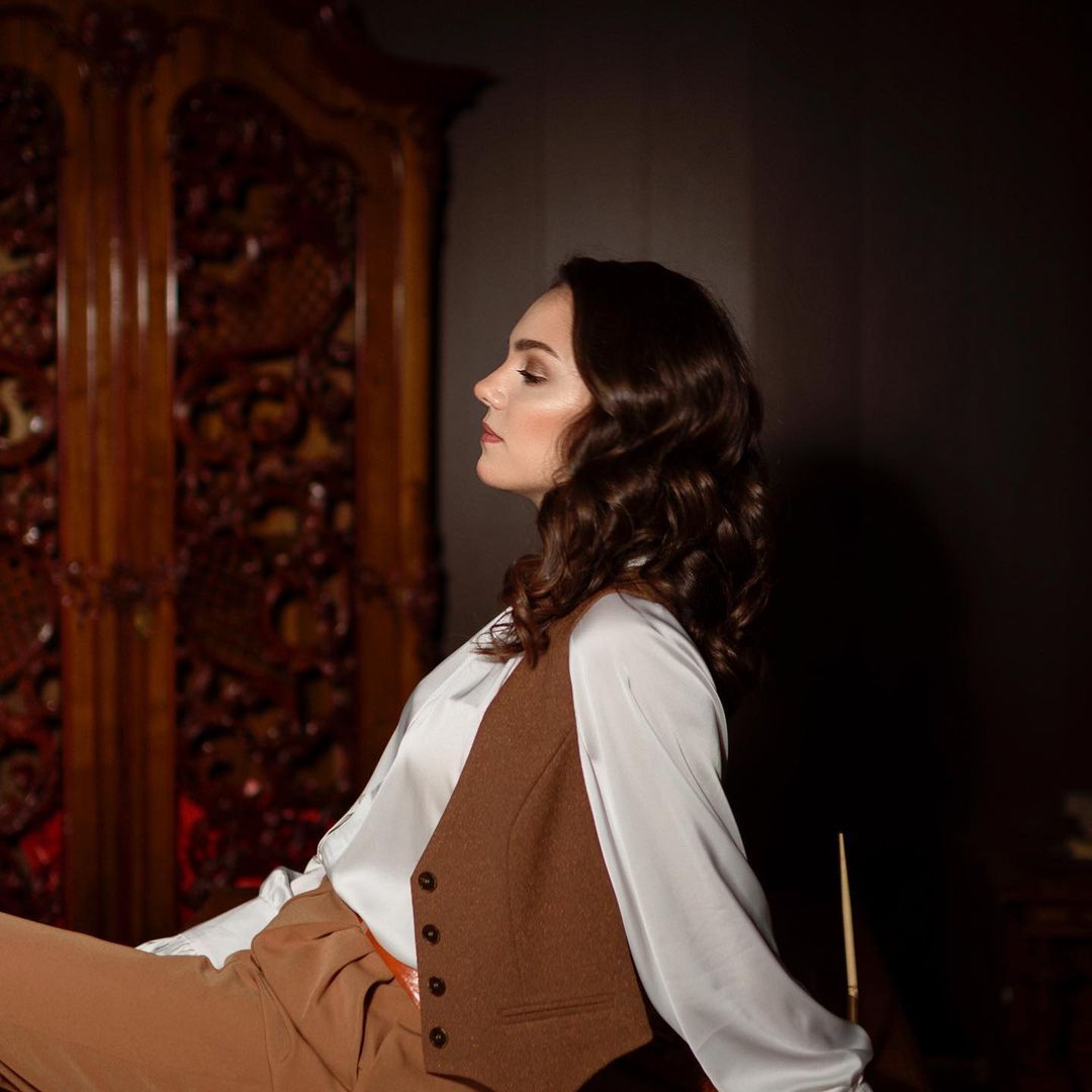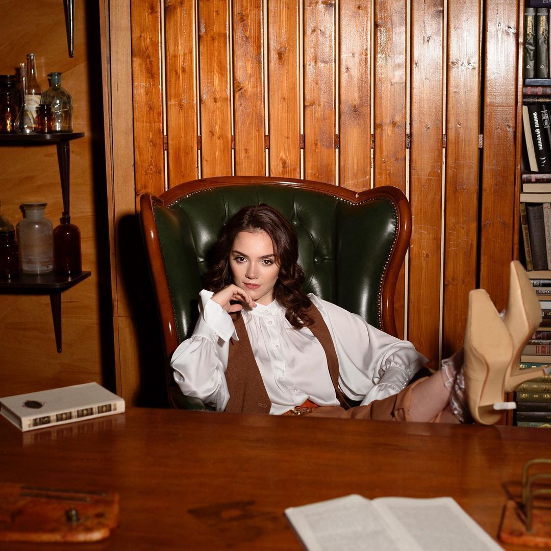 Медведева предстала в достаточно строгом стиле одежды. Она сфотографировалась в комнате с книгами и писательским столом.