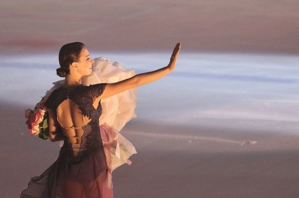Не так давно Щербакова приняла участие в шоу, которое проходило в Сочи. На фотографии видно, как фигуристка покидает лёд с огромным букетом цветов.