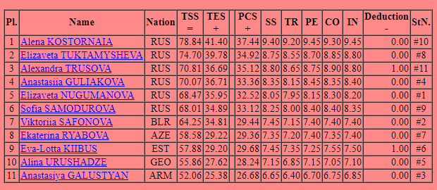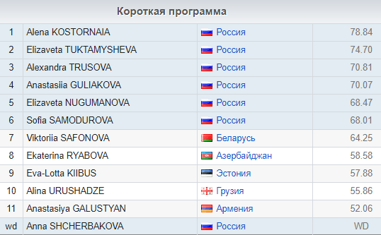 Лидерство после первого соревновательного дня вполне ожидаемо захватила действующая чемпионка Европы Алёна Косторная. За свой прокат Алёна получила 78.84 балла.