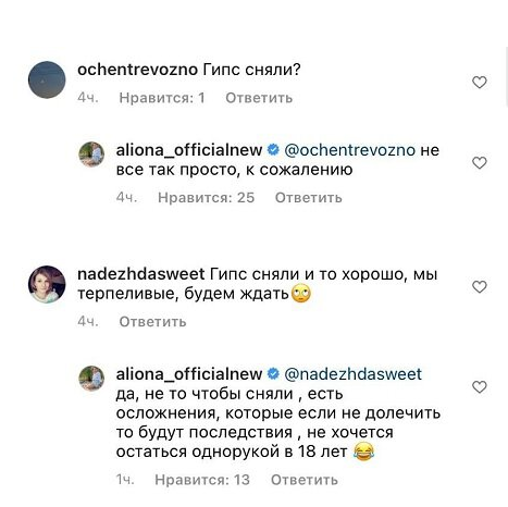- Не всё так просто, к сожалению. Не то чтобы сняли, есть осложнения, которые если не долечить, то будут последствия, не хочется остаться однорукой в 18 лет», – написала Косторная.