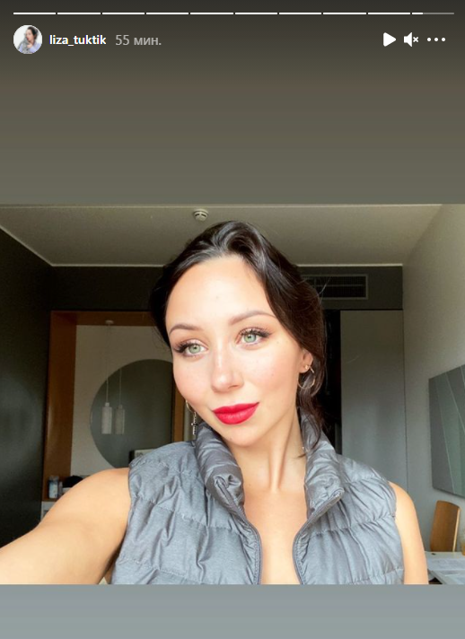 Это селфи 24-летней спортсменки. Туктамышева довольно ярко накрасила губы, а также надела серую жилетку.