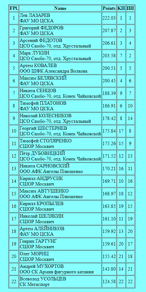 Sport.ru/ Фигурное катание. Сегодня, 27-го августа, проходит первенство Москвы среди юниоров. Стали известны результаты выступлений в группе от 13 до 19 лет по программе кандидатов в мастера спорта.