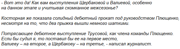 Херш заметил, что московские прокаты приятно впечатлили его, также ветеран заокеанской журналистики оценил выступления девушек-одиночниц, расставив их на условном пьедестале.