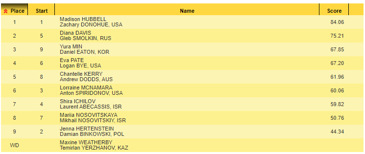 После ритм-танца Диана и Глеб, заработавшие 75.21 балла, идут только на втором месте: лидируют среди пар любимцы американской публики Мэдисон Хаббелл и Захари Донохью. Прокат опытных спортсменов, за спиной которых уже три чемпионата мира, судьи сегодня оценили в 84.06 балла. Напомним, что на последнем чемпионате мира в Стокгольме Хаббелл и Донохью стали вице-чемпионами планеты. Конечно, Диане и Глебу, для которых нынешний сезон является дебютным среди взрослых, будет сложно обойти маститых соперников. На третьей строчке после ритм-танца расположилась корейская пара Юрай Мин и Даниэль Эйтон - 67.85 балла. Произвольный танец дуэты представят уже завтра, соревнования начнутся в 01:00 по Москве.
