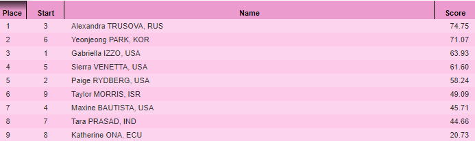 За свой сегодняшний прокат ученица Этери Тутберидзе получила 74.75 балла. Данного результата хватило для того, чтобы после первого соревновательного дня возглавить гонку лидеров. Увы, но походу программы Александра, как и ранее в Челябинске, завалила тройной аксель. Второй сегодня стала кореянка Ёнчжон Парк (71.07), тройку лидеров замкнула представительница США Габриэлла Иццо - 63.93 балла.