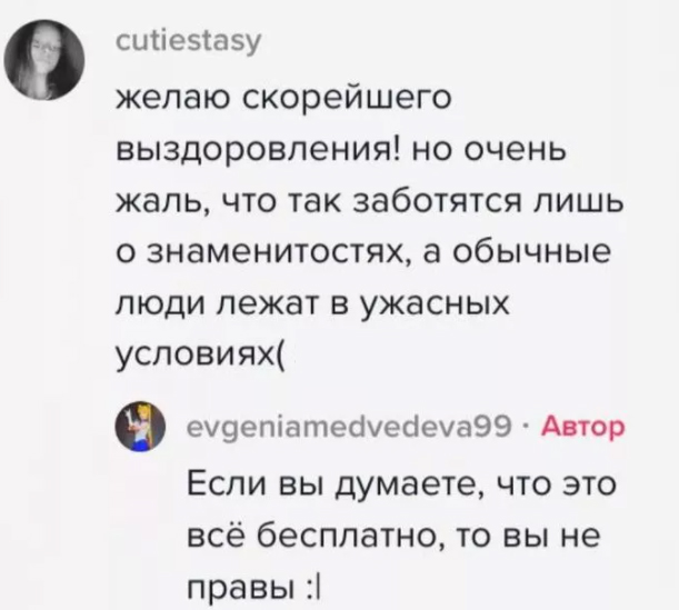 Один из подписчиков написал, что врачи пренебрежительно относятся к простым людям: "Желаю скорейшего выздоровления. Но очень жаль, что так заботятся лишь о знаменитостях, а обычные люди лежат в ужасных условиях", - написал фанат.