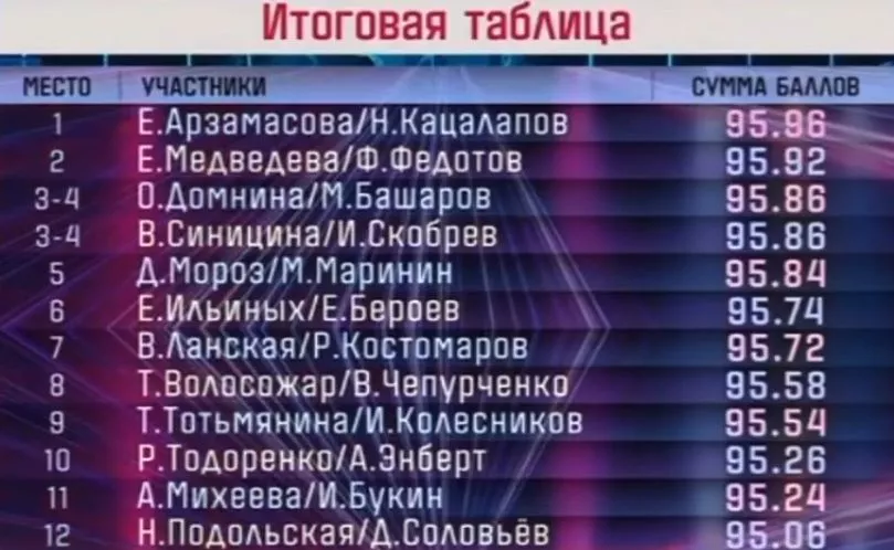 Второе место заняли Евгения Медведева, которая является двукратной чемпионкой мира, и актёр Фёдор Федотов.