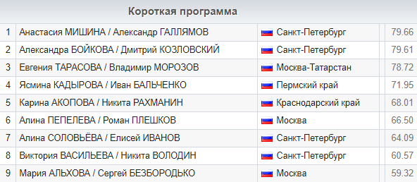 Вторыми стали ещё одна пара из северной столицы Александра Бойкова и Дмитрий Козловский — 79,61 балла. Тройку лидеров замкнул дуэт из Москвы Евгения Тарасова/Владимир Морозов (78,72).