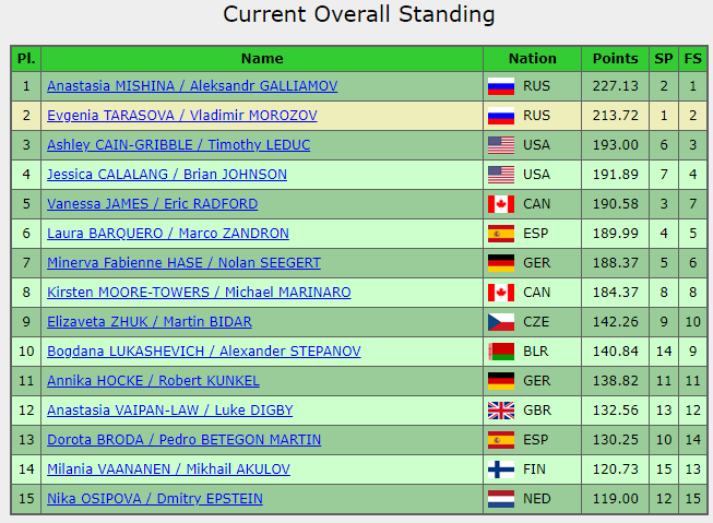 За два проката российская пара заработала 227,13 балла. Данного результата хватило, что оставить за своей спиной ещё одну пару из России Евгения Тарасова/ Владимир Морозов (213,72 балла).