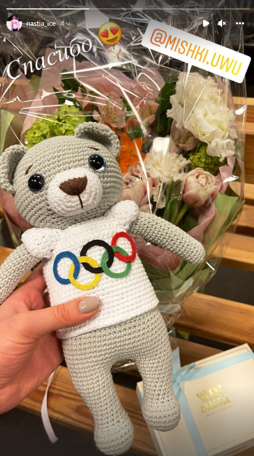 Анастасия Мишина получила игрушечного медведя с олимпийскими кольцами.