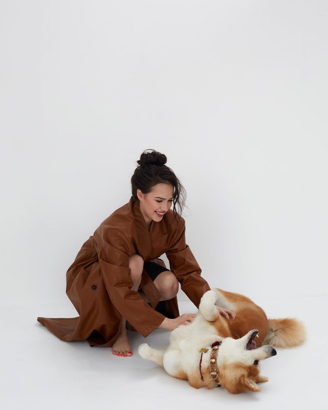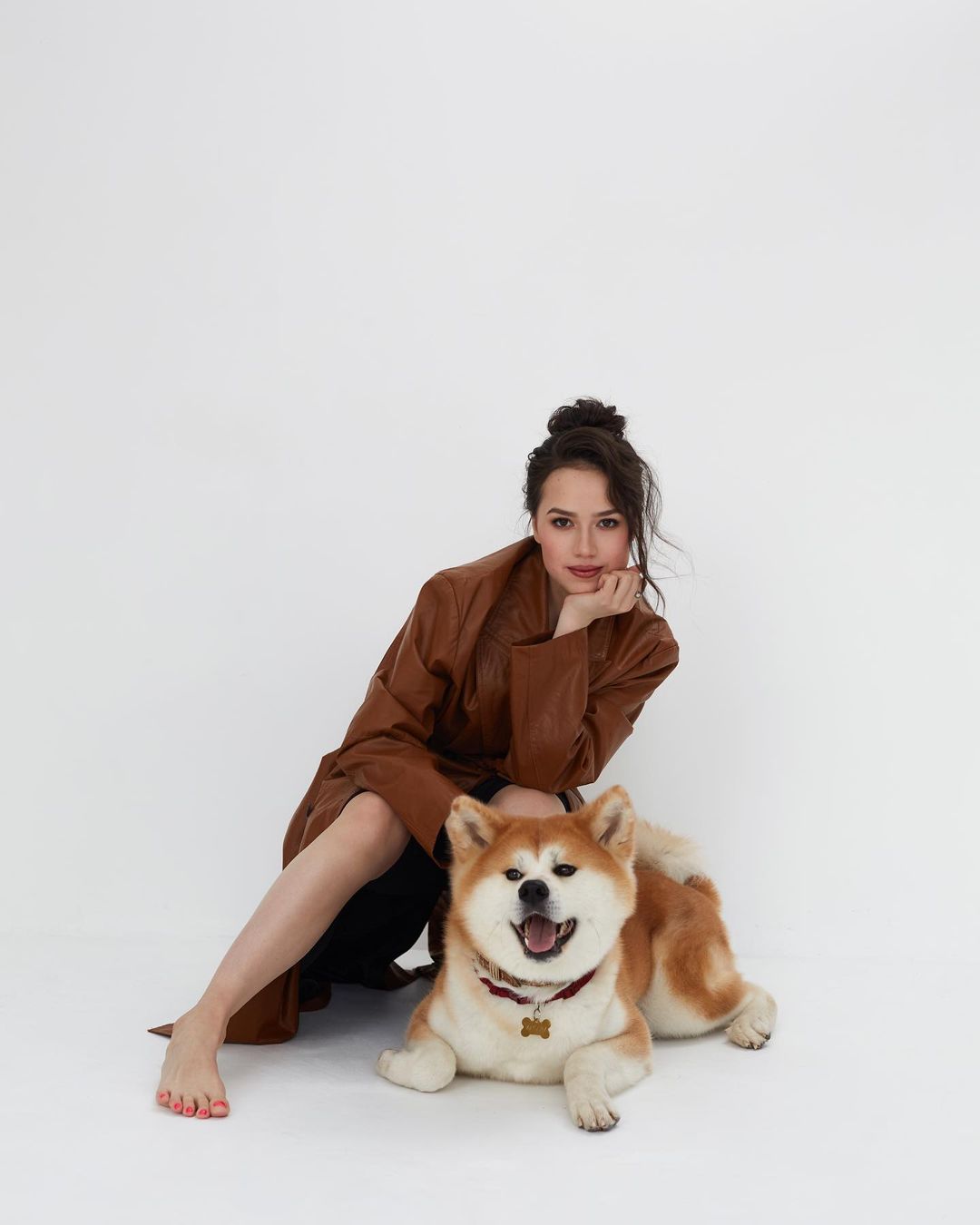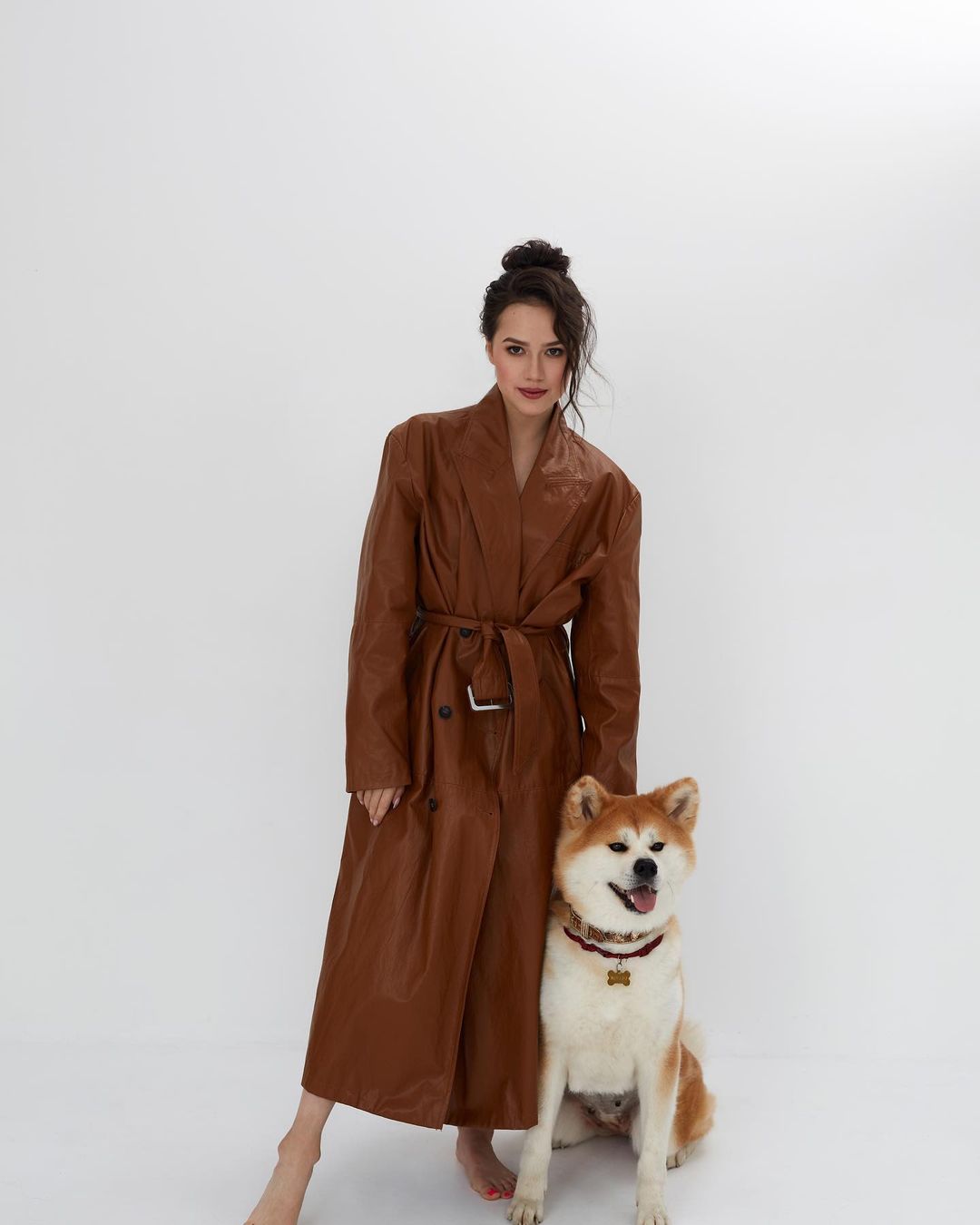 На фото Загитова изображена в эффектном коричневом плаще вместе со своей собакой.
