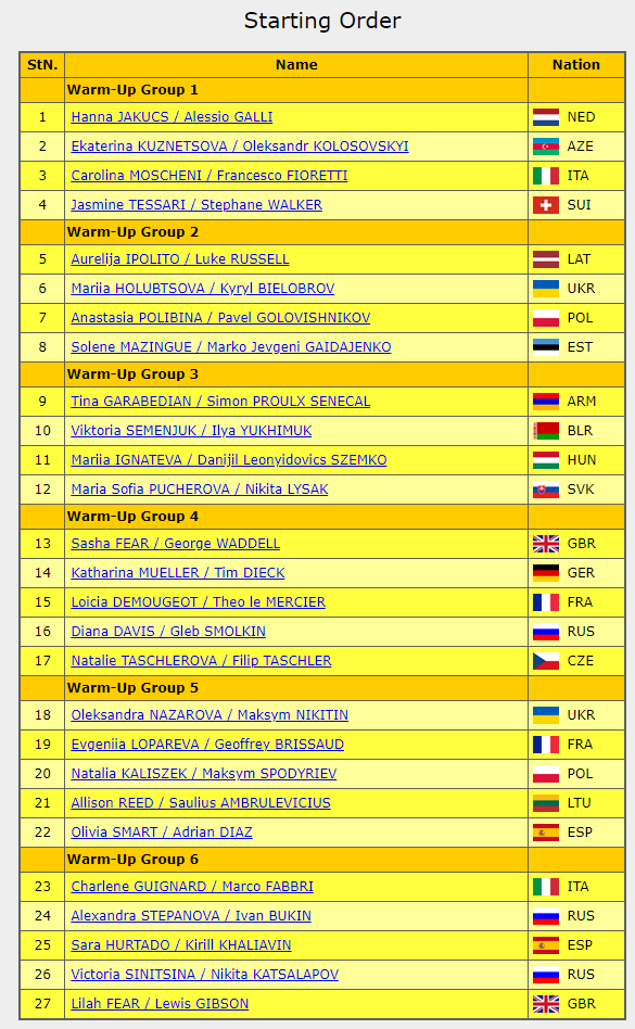 Дочь Этери Тутберидзе Диана Дэвис и её партнёр Глеб Смолкин выйдут на лёд 16-ми и войдут в четвёртую разминочную группу. Ещё две пары выступят в заключительной шестой разминке. Александра Степанова и Иван Букин выйдут на лёд 24-ми, а Виктория Синицина и Никита Кацалапов 26-ми.