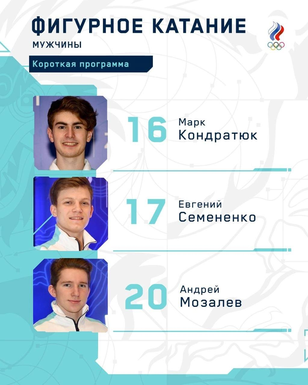 Участие в соревнованиях примут 30 фигуристов. Их должно было быть 31, но американец Винсент Чжоу также заразился коронавирусом. Первым среди россиян на лёд выйдет Марк Кондратюк, он выступит 16-м. Следом за ним короткую программу представит Евгений Семененко, а последним из россиян будет Андрей Мозалёв (20).