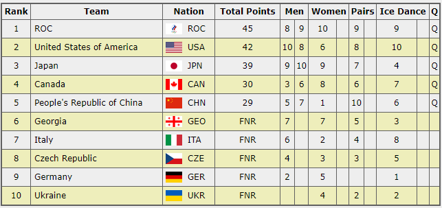 Таким образом, Россия заняла промежуточное первое место по итогам коротких программ, имея в активе 36 очков. США стали вторыми с 34 очками. Также в произвольную программу прошли Япония, Китай и Канада. Фигуристы из Грузии, Италии, Украины, Чехии и Германии не сумели пройти во второй этап командного турнира.